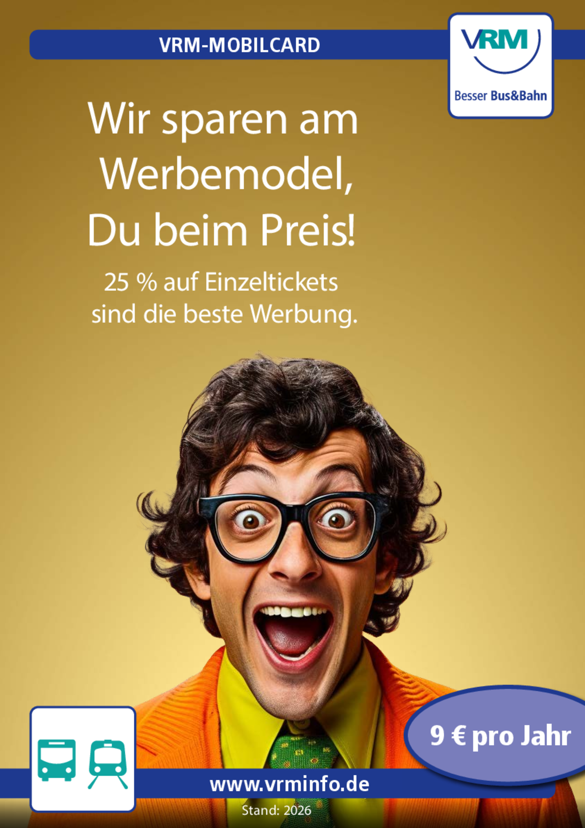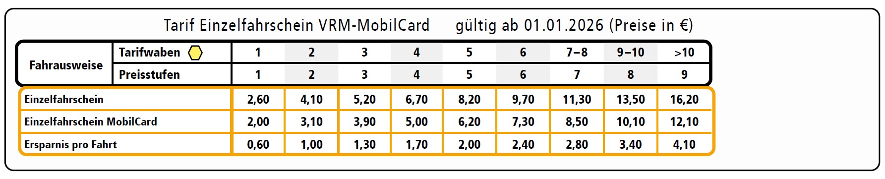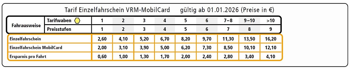 Dank der VRM-MobilCard steht Ihre nächste Ersparnis nicht in den Sternen geschrieben. Stattdessen fahren Sie auf jeder Strecke richtig Rabatte ein. Bei einer Jahresgebühr von nur 9 Euro bekommen Sie bei jedem Einzelfahrschein ordentliche 25 % Rabatt. Ganz gleich, welche Preisstufe Sie bei Bussen und Bahnen wählen.
