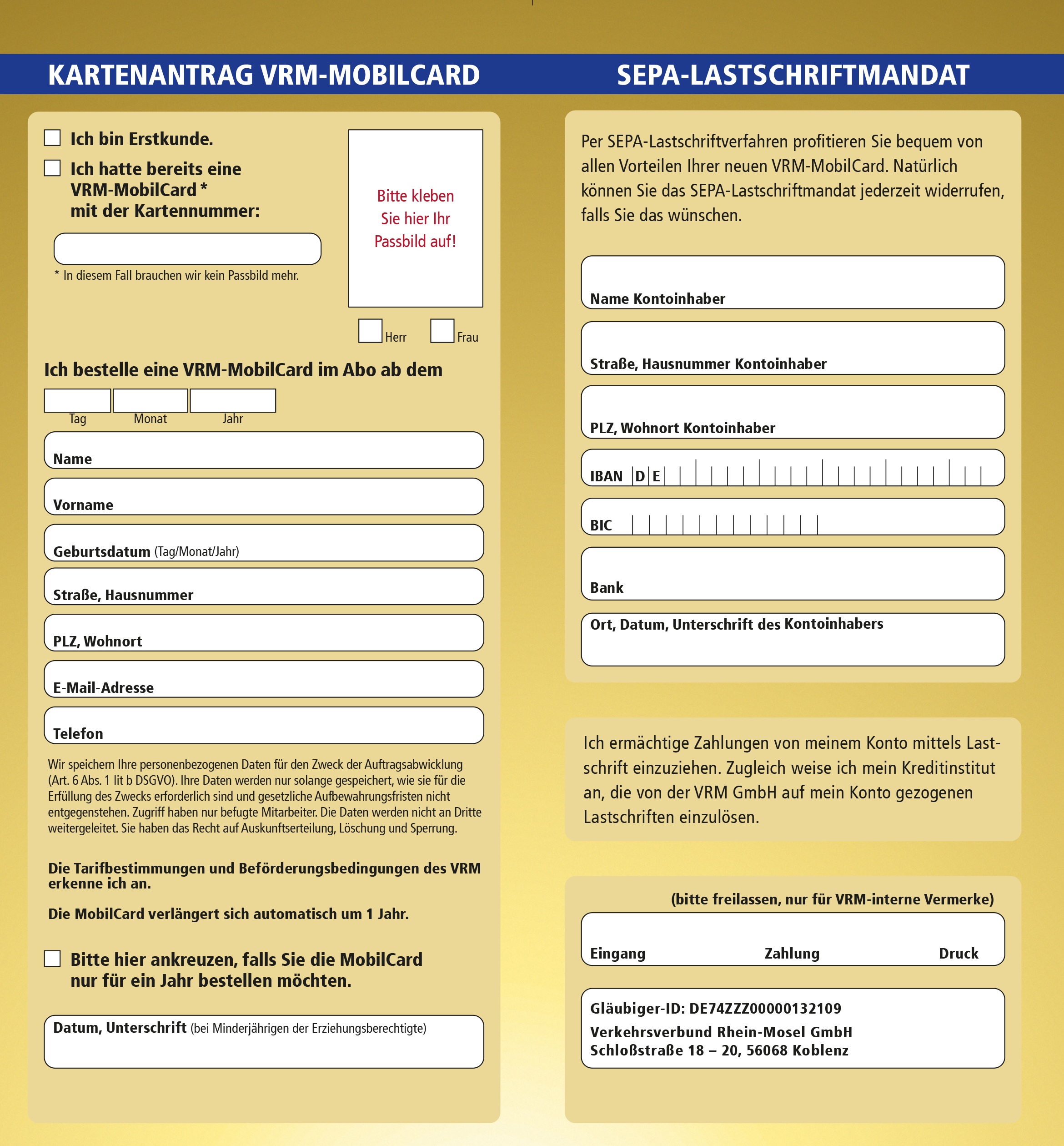 Antrag ausfüllen, Passbild aufkleben und den Antrag bis zum 10. eines Monats an den VRM-MobilCard-Service, Schlossstraße 18 – 20, 56068 Koblenz senden.