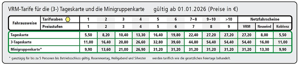 Preistabelle für Tages- und Minigruppenkarten