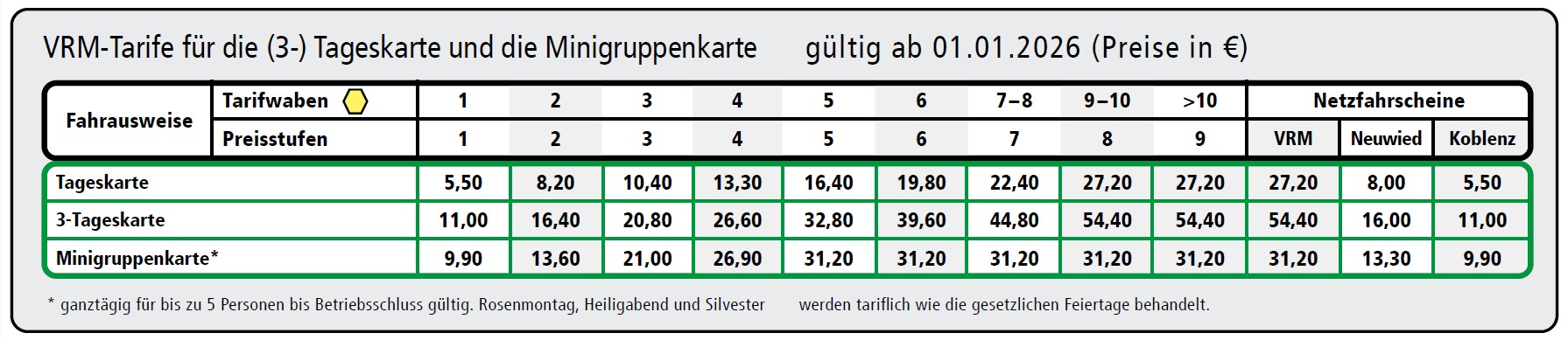 Die Tageskarte, 3-Tageskarte und die Minigruppenkarte sind auch als Netzfahrscheine erhältlich. Sie wollen das gesamte Verbundgebiet erkunden oder in Koblenz oder Neuwied die Seele baumeln lassen? Mit den Netzfahrscheinen sind Sie für die Gültigkeitsdauer in diesen Gebieten grenzenlos unterwegs.