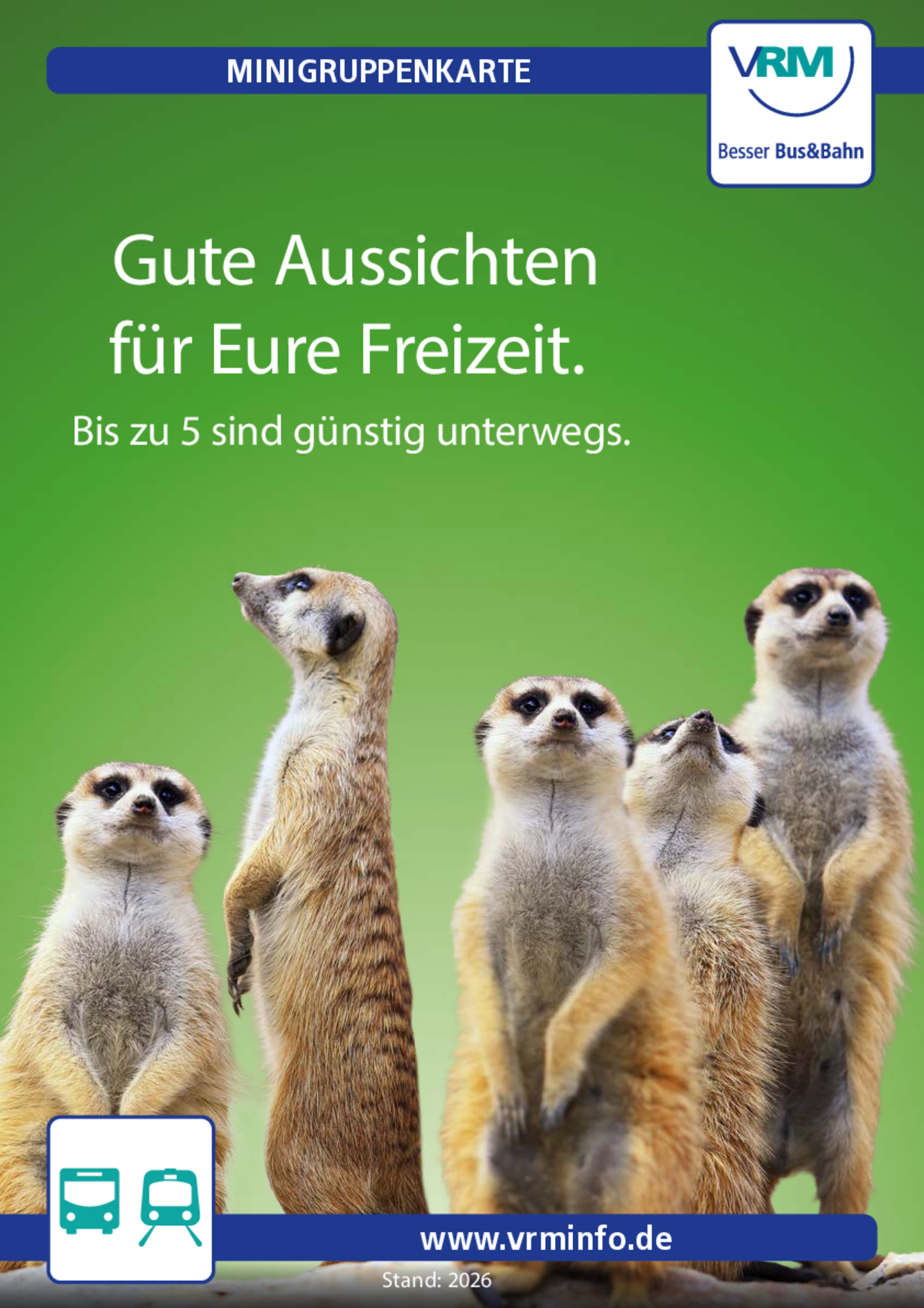 Finden Sie sich gerne mit Freunden, Kollegen, der Familie oder Verwandten in der Freizeit zusammen, dann ist die Minigruppenkarte die richtige Wahl. Das Ticket gilt einen ganzen Tag lang für fünf Personen für beliebig viele Fahrten - ganz gleich ob Werktag, Wochenende oder Feiertag. Die Ersparnis steigt dabei mit jedem Mitfahrenden in die Höhe: Die Minigruppenkarte kostet maximal 31,20 Euro im gesamten VRM-Gebiet. Umgelegt sind das je nach Preisstufe nur zwischen 1,98 und 6,24 Euro pro Person.