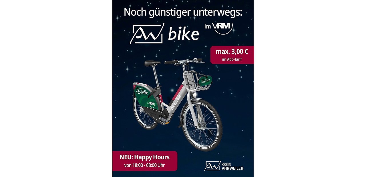 Mit den neuen „Happy Hours“ wird das AWbike noch attraktiver: Ab sofort zahlen Nutzerinnen und Nutzer in den Abend- und Nachtstunden zwischen 18 Uhr abends bis 8 Uhr am Morgen des folgenden Tages insgesamt maximal drei Euro im Abo-Tarif beziehungsweise maximal sechs Euro im Basistarif.