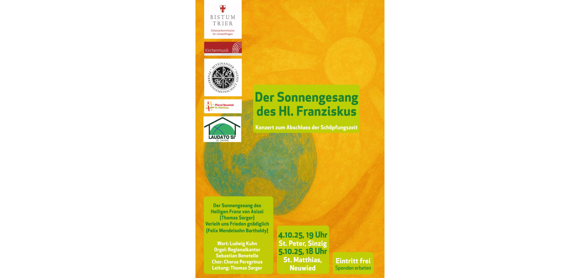 Konzert zum Abschluss der Ökumenischen Schöpfungszeit am 4. Oktober, 19.00 Uhr in St. Peter, Sinzig. Die diesjährige Ökumenische Schöpfungszeit wird im Bistum Trier abgeschlossen mit einem dialogischen Konzert, das unter Leitung von Thomas Sorger, Trier / Bistumsreferent für Kirchenmusik am 4. Oktober in Sinzig St. Peter aufgeführt wird. Der Sonnengesang des Hl. Franziskus, der vor 800 Jahren entstand, wird in Komposition von Thomas Sorger in einen Dialog mit dem Schreiben von Papst Franziskus „Laudato si – in Sorge um das gemeinsame Haus“ gestellt.
