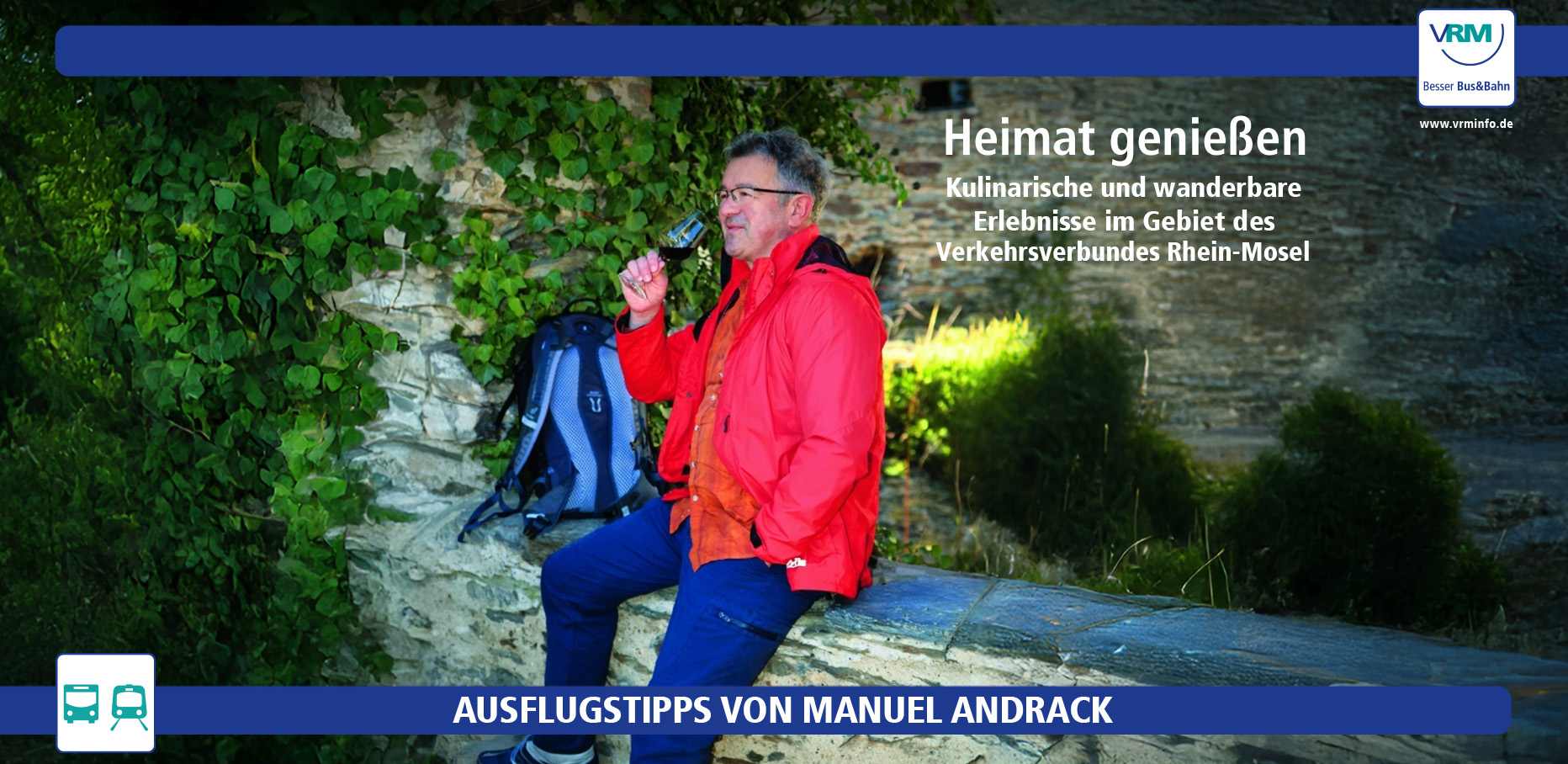 In der 32seitigen Broschüre gibt Manuel Andrack viele wertvolle Erlebnis-Tipps. Diesmal geht es nach Ahrweiler, Bad Marienberg, Beilstein, Boppard, Koblenz und Neuwied – also einmal quer durch das VRM-Gebiet. Die Orte sind selbstverständlich sehr gut an den ÖPNV angebunden. Um einen Wander- und Genussausflug planen zu können, findet der Leser Tipps für die Routenplanung mit Bus und Bahn.